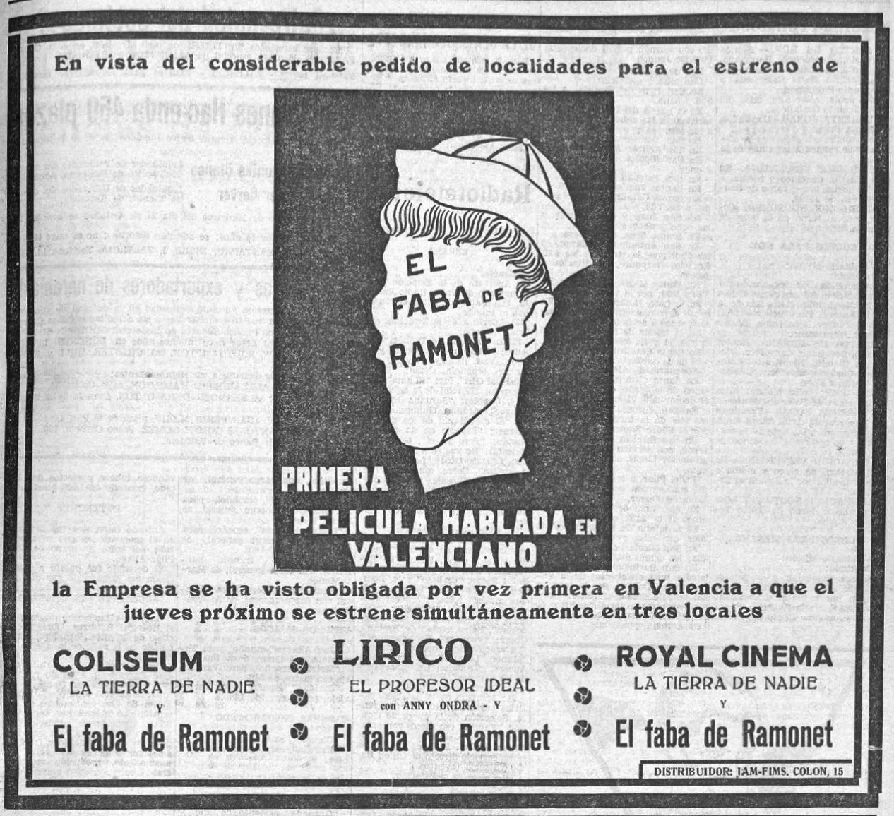 Era la tardor de 1933, concretament un dijous 9 de novembre, quan a les sales el Coliseum, el Lírico i el Royal, a València capital, s’estrenava simultàniament ‘El fava de Ramonet’. Un migmetratge de 39 minuts de duració, dirigit per Joan Andreu Moragas, que adaptava l’obra teatral de Lluís Martí Alegre (tio de Luis García Berlanga) i Ismael Serneguet, famosos dramaturgs valencians especialitzats en el sainet. Esta pel·lícula marcava un abans i un després a la història del cinema valencià perquè es convertia en la primera pel·lícula dialogada en la nostra llengua. El valencià s’escoltava per primera vegada a una pantalla de cinema, i la fita acaparava l’atenció de gran part del col·lectiu valencianista d’aquells anys.